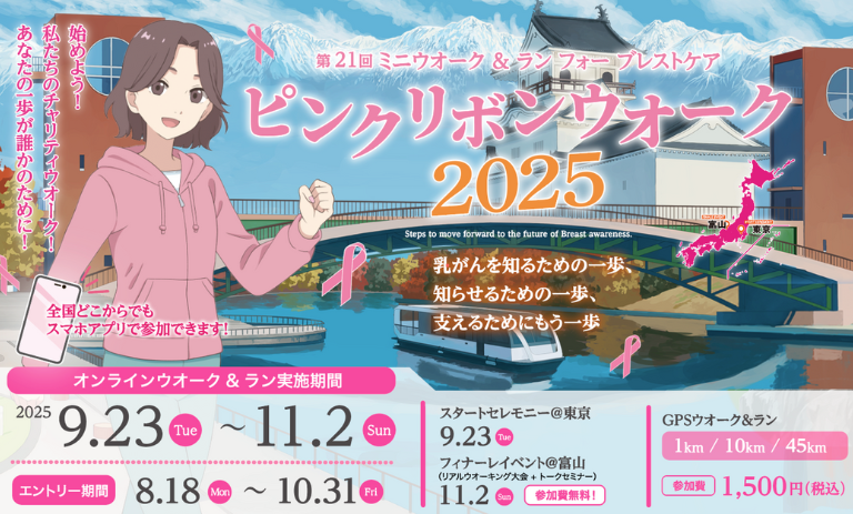 乳房健康研究会が日本で初めて乳がん啓発を目的にしたスポーツイベント「ミニウオーク&ラン フォーブレストケア」。21回大会は第13回日本乳房オンコプラスティックサージャリー学会総会との共催です。