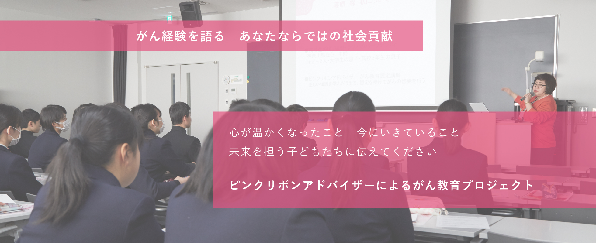 ピンクリボンアドバイザーの中のがん経験者が学校で授業。知識と経験に基づいたことばが子どもたちの心に響きます。