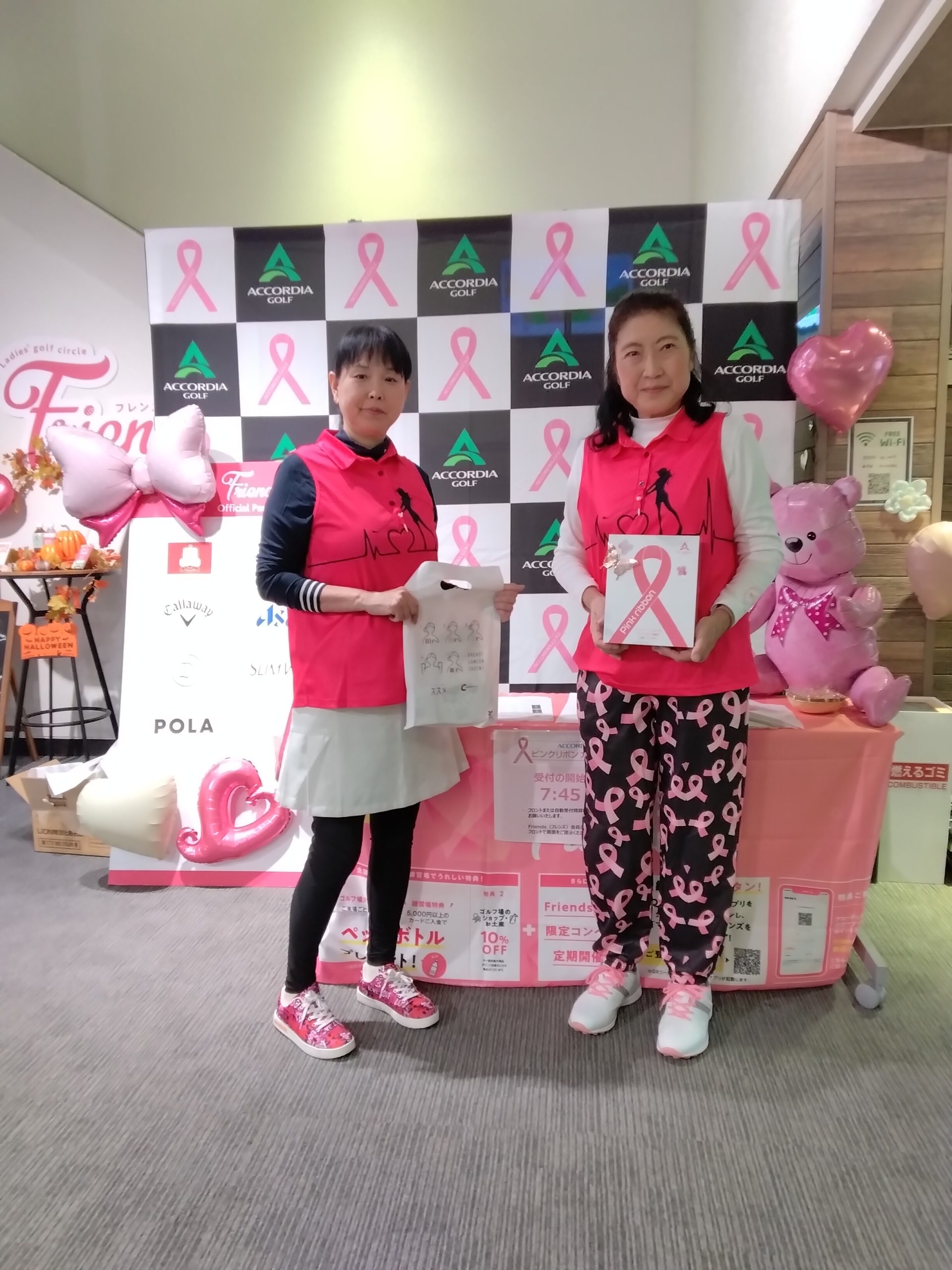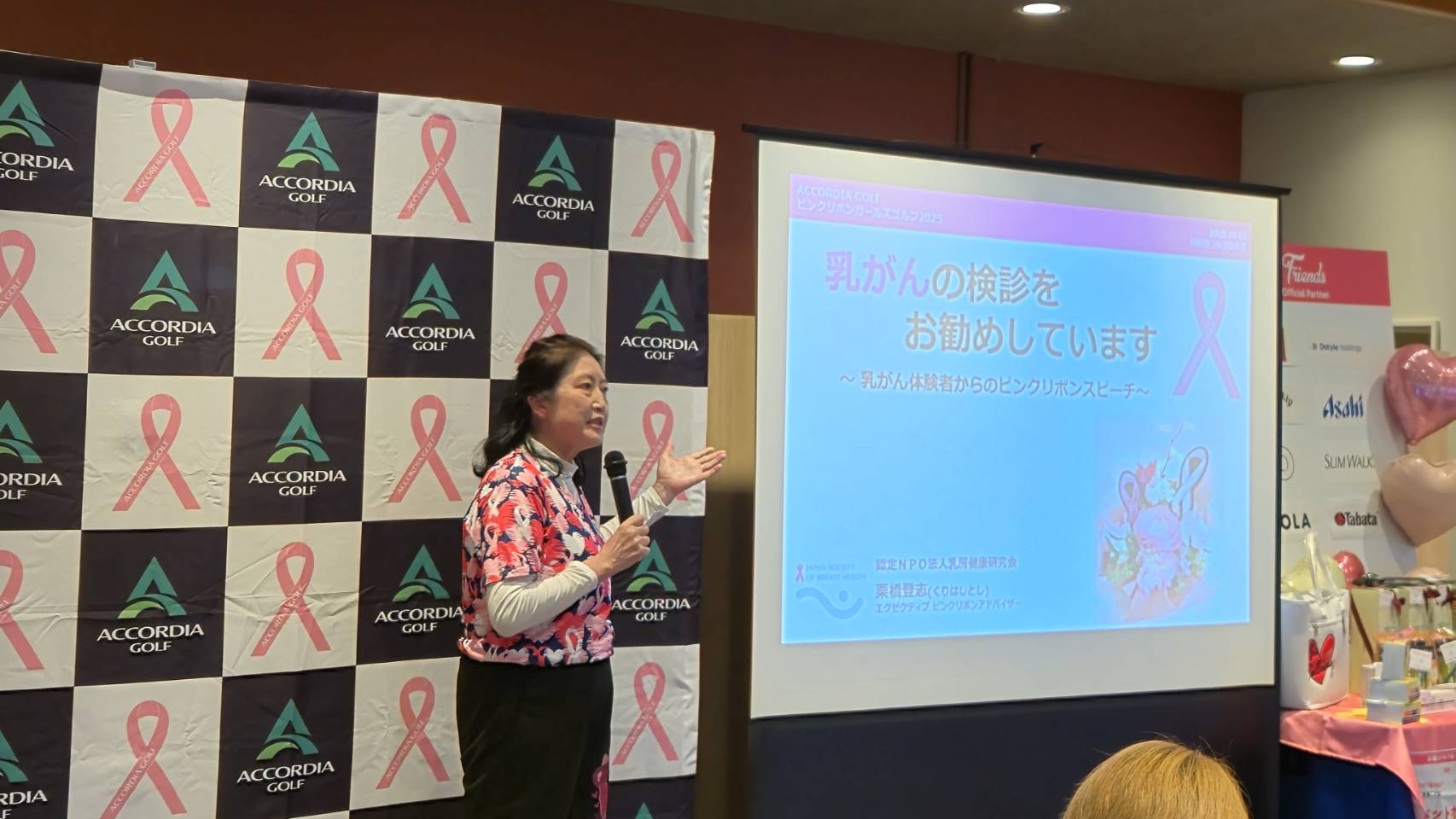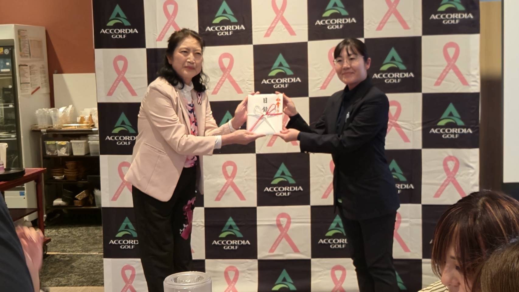 アコーディア・ゴルフは、女性がより健康にいきいきとゴルフを楽しむことができるよう、乳がんの早期発見・検診・治療の大切さを啓発する「ピンクリボン活動」を2010年から継続して応援しています。このイベントもその一環として実施されており、アコーディア・ゴルフ様から当会の社会貢献活動に対し、本年も多額の寄付を頂戴いたしました。厚く御礼申し上げます。