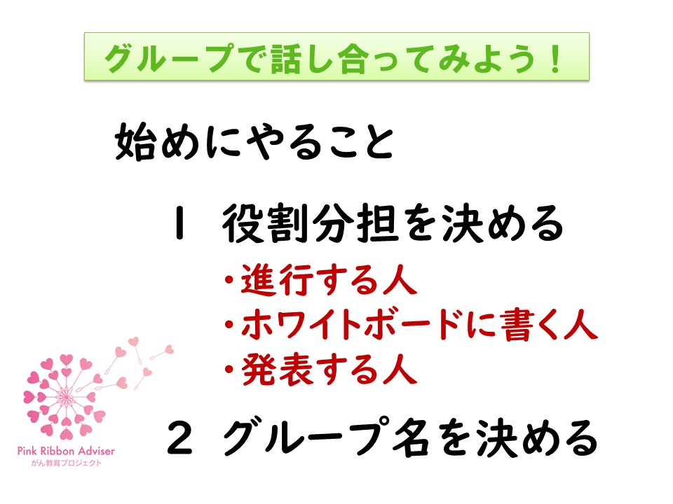 グループワークでは、ボランティアとして参加したピンクリボンアドバイザーがサポートし、生徒の皆さんが安心して意見を出せる環境の中で進めることができました。それぞれのテーマについて、生徒同士で考えを深めながら意見が交わされ、がんについての理解を広げるとともに、自分自身や周囲の人との関わりについても考える時間となりました。
