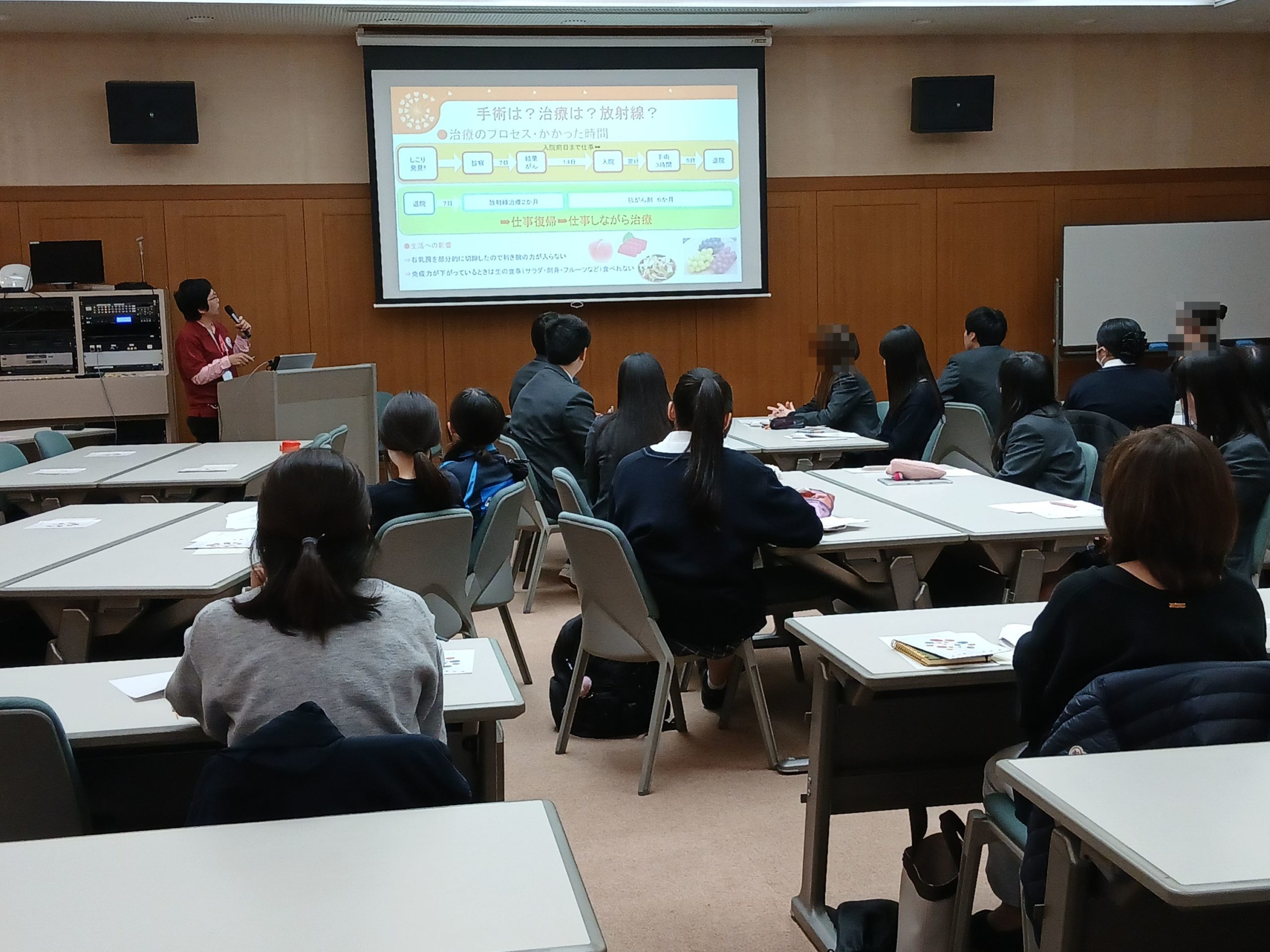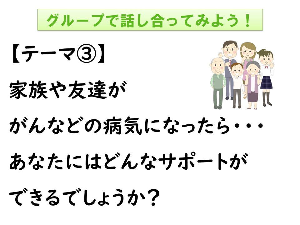 診療放射線技師として働いている講師が、医療従事者として、さらにがん経験者として、自身の経験を交えながらお話し、その後グループワークを行いました。