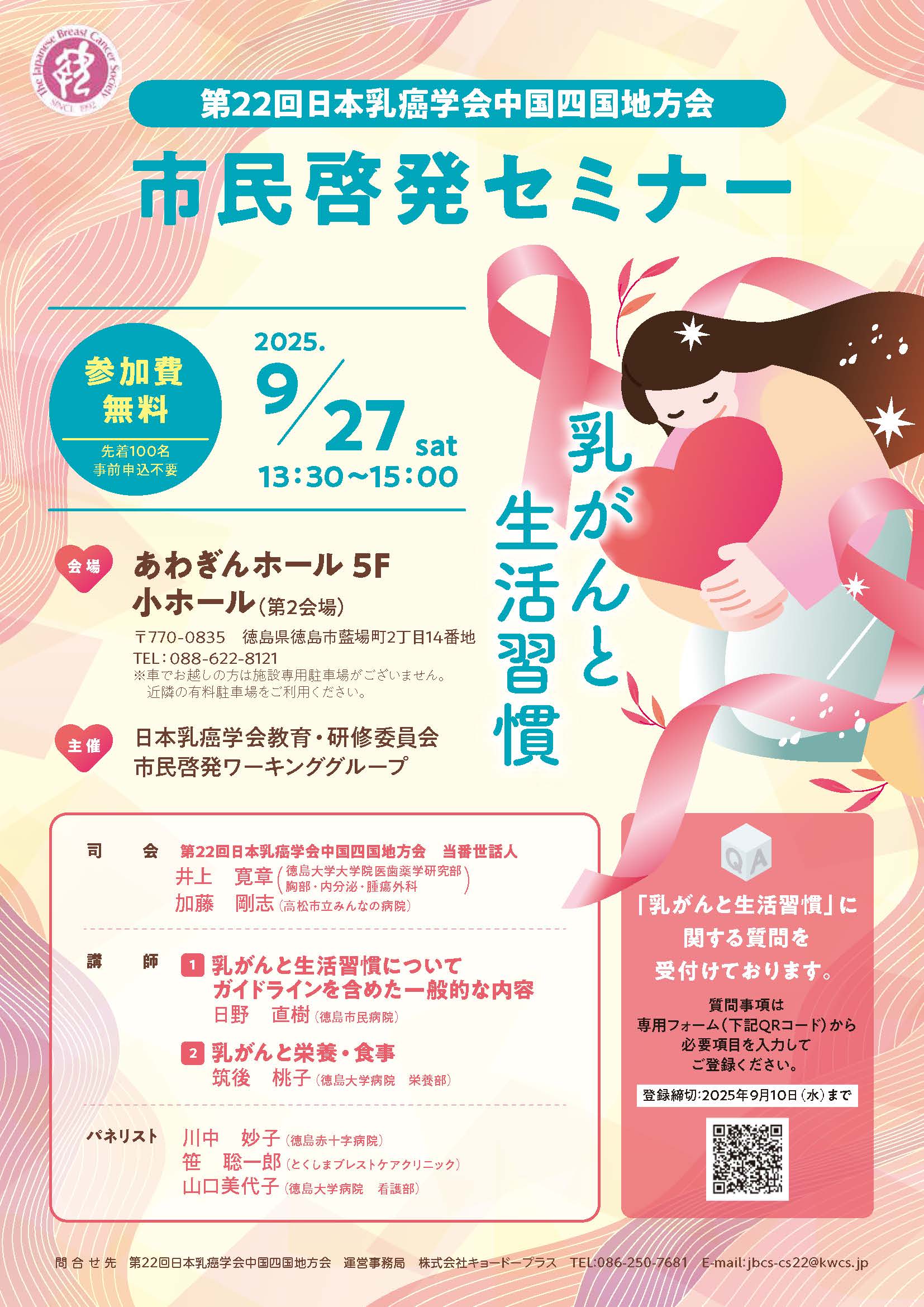 乳癌学会地方会の開催にあわせ、市民の皆さまを対象とした啓発セミナーを開催いたします。今回のテーマは「乳がんと生活習慣」です。乳がんの発症や再発には、食事・運動・飲酒・喫煙など日々の生活習慣が深く関わっています。セミナーでは、最新の医学的知見をもとに、どのような生活習慣が予防や再発リスク低減につながるのかをわかりやすく解説いたします。乳がん経験の有無にかかわらず、どなたでもご参加いただけます。