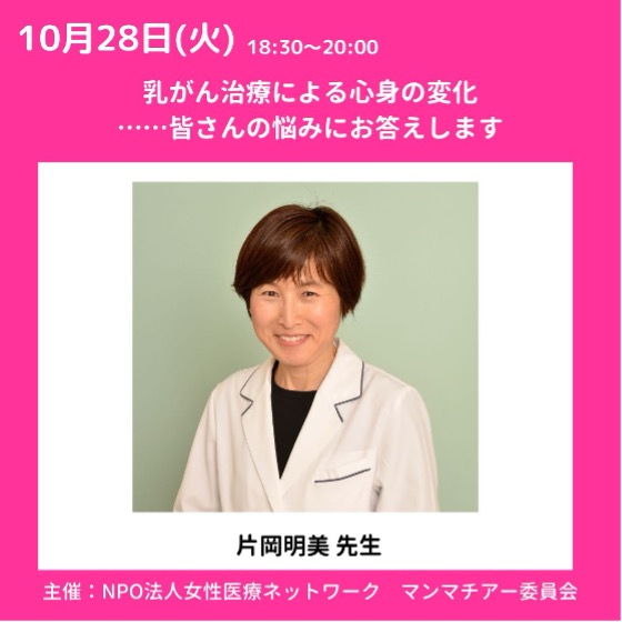 ピンクリボン強化月間の10月はマンマチアー設立当初からアドバイザリーボードとして参画いただいている乳腺外科医の片岡明美先生のご登壇です。