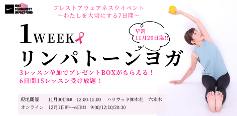NIKE・コミュニティ・インパクト・ファンドの助成金を受けて開発されたリンパトーンヨガを中心とした、トレーナーたちの多彩なオンラインレッスンを楽しみながら3レッスン受講にチャレンジしてください!リンパトーンヨガは乳がん術後の方にも配慮されたヨガです。