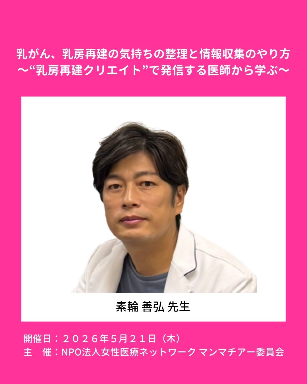 5月のマンマチアーは、乳がんや乳房再建の気持ちの整理と情報収集の方法、SDM (Shared Decision Making)の考え方を素輪善弘先生(自治医科大学形成外科学教授)にお話いただきます。また乳房再建の最新治療「内視鏡LD/DIEP再建手術」についても紹介いただきます。ぜひご参加ください。